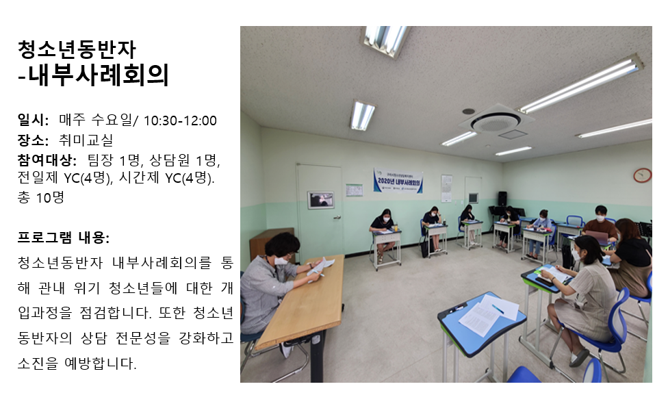 청소년상담복지센터 2020년 7월 YC 내부사례회의 작성자 관리자 등록일자 2020년 8월 5일 10시 10분 27초 조회 296 1596589827_photo_table.png [ Size : 619.73KB , Down : 136 ] 미리보기 다운로드 목록보기