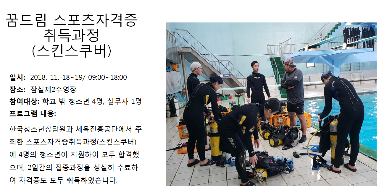 청소년상담복지센터 2018년 11월 스포츠자격증 취득과정 (스킨스쿠버) 작성자 관리자 등록일자 2018년 12월 7일 13시 8분 25초 조회 343 1544155705_photo_table.png [ Size : 913.82KB , Down : 113 ] 미리보기 다운로드 목록보기
