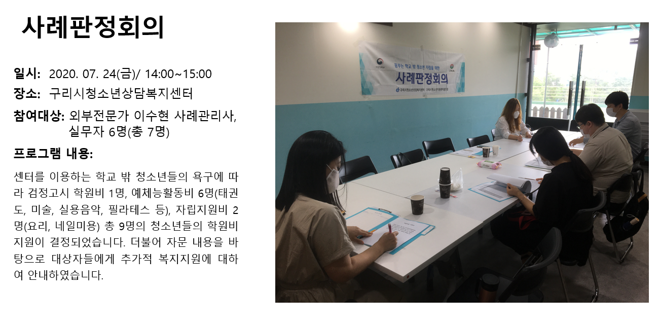 청소년상담복지센터 2020년 7월 사례판정회의 작성자 관리자 등록일자 2020년 8월 5일 13시 29분 10초 조회 292 1596601750_photo_table.png [ Size : 845.71KB , Down : 119 ] 미리보기 다운로드 목록보기