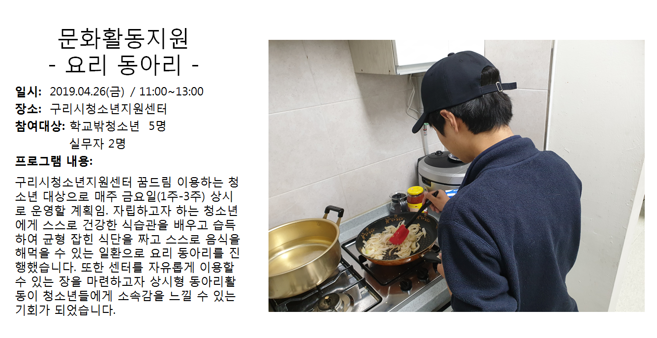 청소년상담복지센터 2019년 4월 문화활동지원 - 요리동아리 작성자 관리자 등록일자 2019년 5월 2일 13시 45분 28초 조회 278 1556772328_photo_table.png [ Size : 800.58KB , Down : 106 ] 미리보기 다운로드 목록보기