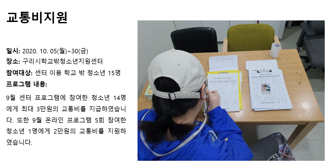 청소년상담복지센터 2020년 10월 교통비지원 작성자 관리자 등록일자 2020년 11월 10일 11시 53분 27초 조회 296 1604976807_photo_table.png [ Size : 726.28KB , Down : 124 ] 미리보기 다운로드 목록보기