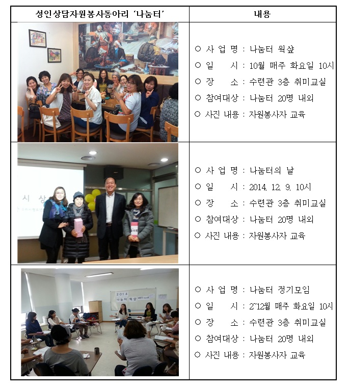 청소년상담복지센터 2014년 성인자원봉사자 동아리 '나눔터' 작성자 관리자 등록일자 2014년 12월 31일 9시 45분 3초 조회 515 구리시청소년상담복지센터 2014년 성인자원봉사자 동아리 '나눔터' 활동 1419986703_photo_table.jpg [ Size : 160.4KB , Down : 104 ] 미리보기 다운로드 목록보기