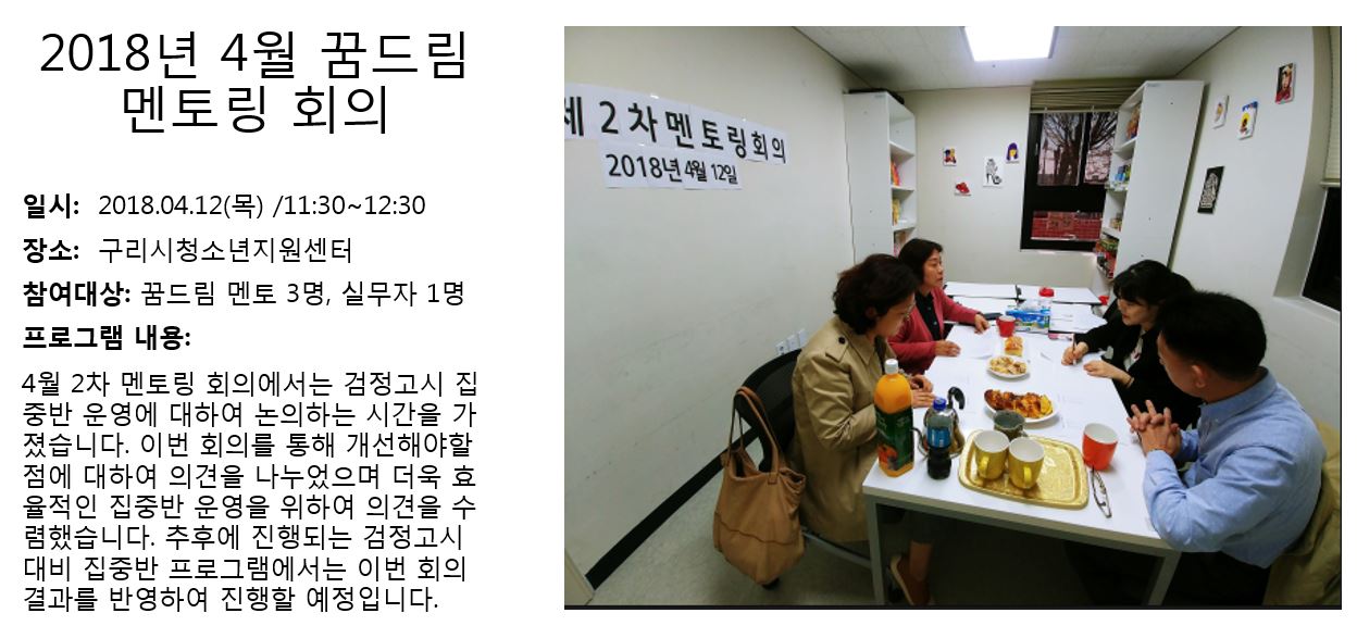 청소년상담복지센터 2018년 4월 꿈드림 멘토링 회의 작성자 관리자 등록일자 2018년 5월 2일 18시 5분 50초 조회 320 1525251950_photo_table.jpg [ Size : 128.79KB , Down : 108 ] 미리보기 다운로드 목록보기