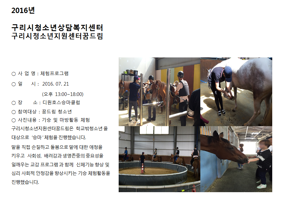 청소년상담복지센터 [꿈드림] 체험프로그램 '승마' 작성자 관리자 등록일자 2016년 7월 27일 10시 39분 21초 조회 529 내용없음 1469583561_photo_table.png [ Size : 645.09KB , Down : 110 ] 미리보기 다운로드 목록보기