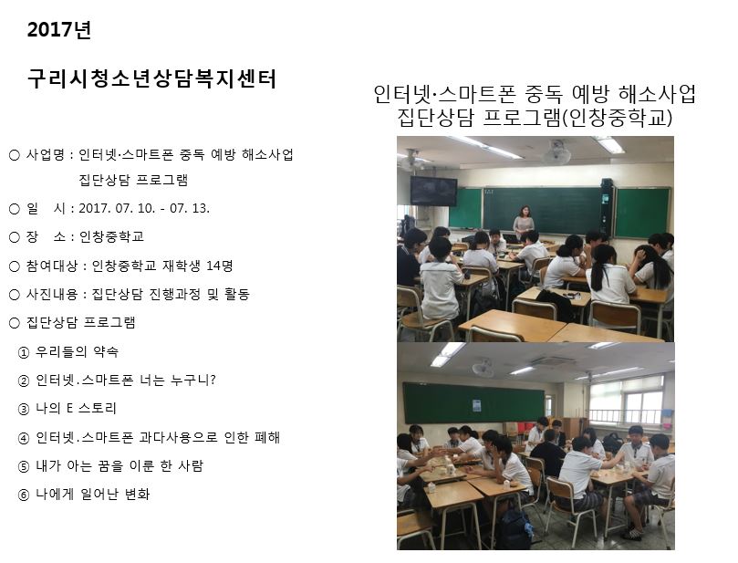 청소년상담복지센터 인터넷.스마트폰 중독예방 해소사업 집단상담 프로그램(인창중) 작성자 관리자 등록일자 2017년 8월 3일 17시 39분 4초 조회 388 1501749544_photo_table.jpg [ Size : 79.99KB , Down : 103 ] 미리보기 다운로드 목록보기