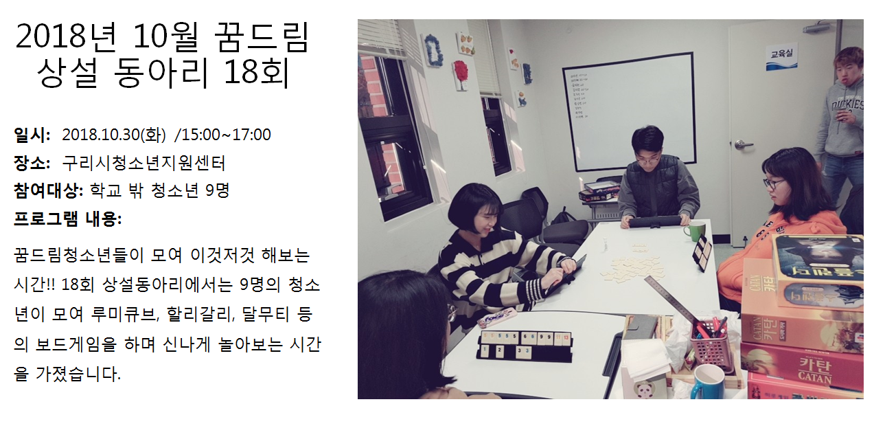 청소년상담복지센터 2018년 10월 상설동아리 18회 작성자 관리자 등록일자 2018년 11월 8일 9시 32분 21초 조회 332 1541637141_photo_table.png [ Size : 764.77KB , Down : 96 ] 미리보기 다운로드 목록보기