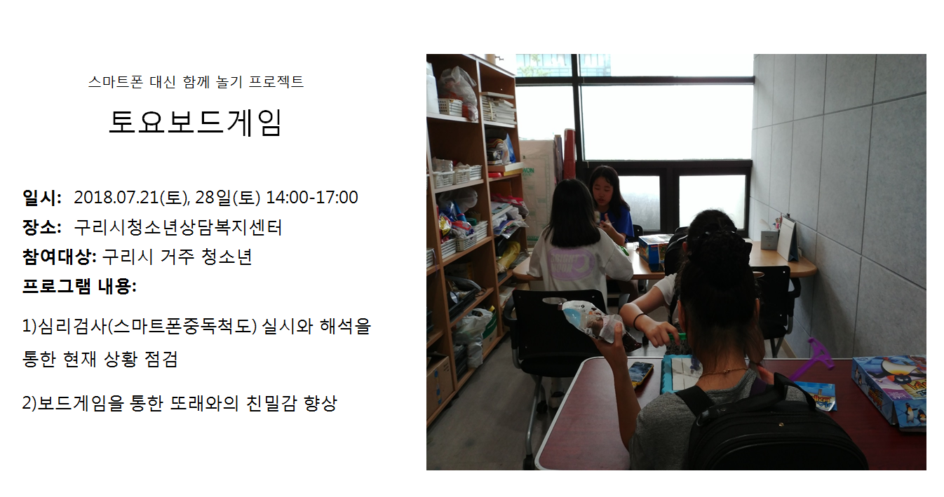청소년상담복지센터 7월 토요보드게임-스마트폰 대신 함께놀기 프로젝트 작성자 관리자 등록일자 2018년 7월 31일 14시 30분 45초 조회 359 1533015045_photo_table.png [ Size : 759.73KB , Down : 116 ] 미리보기 다운로드 목록보기