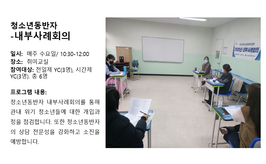 청소년상담복지센터 2020년 12월 YC 내부사례회의 작성자 관리자 등록일자 2021년 1월 7일 9시 29분 6초 조회 525 1609979346_photo_table.png [ Size : 407.57KB , Down : 151 ] 미리보기 다운로드 목록보기