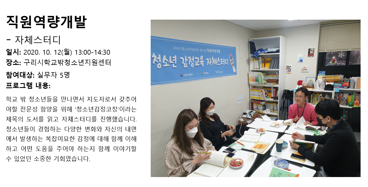 청소년상담복지센터 2020년 10월 직원역량개발 작성자 관리자 등록일자 2020년 11월 10일 11시 54분 39초 조회 380 1604976879_photo_table.png [ Size : 744.05KB , Down : 129 ] 미리보기 다운로드 목록보기