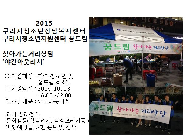 청소년상담복지센터 [꿈드림] 찾아가는거리상담'야간아웃리치' 작성자 관리자 등록일자 2015년 10월 30일 11시 46분 38초 조회 544 1446173198_photo_table.jpg [ Size : 68.07KB , Down : 115 ] 미리보기 다운로드 목록보기