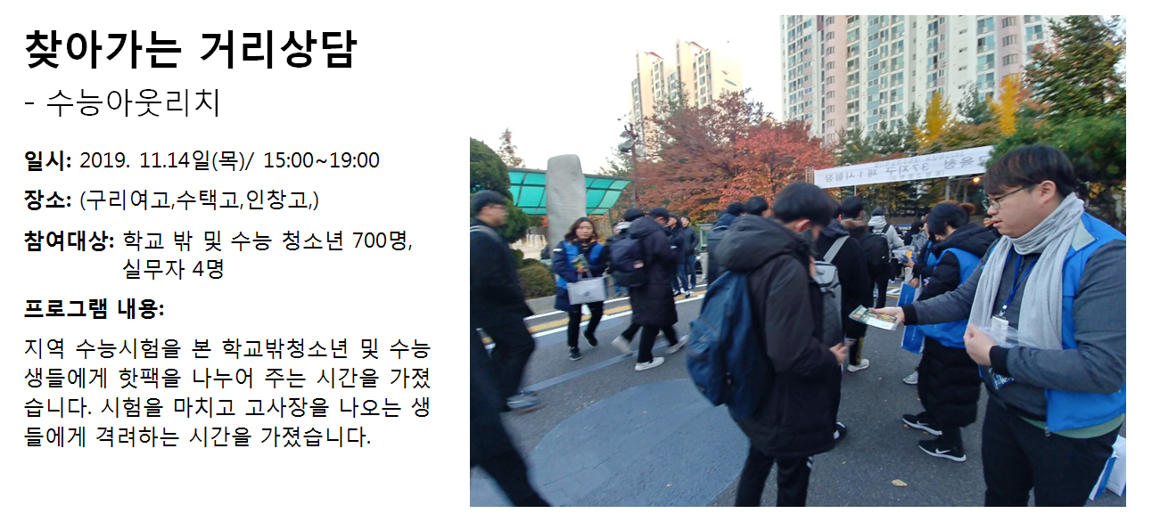 청소년상담복지센터 2019년 11월 찾아가는 거리상담 - 수능아웃리치 작성자 관리자 등록일자 2019년 12월 4일 11시 49분 14초 조회 325 1575427754_photo_table.png [ Size : 934.9KB , Down : 122 ] 미리보기 다운로드 목록보기