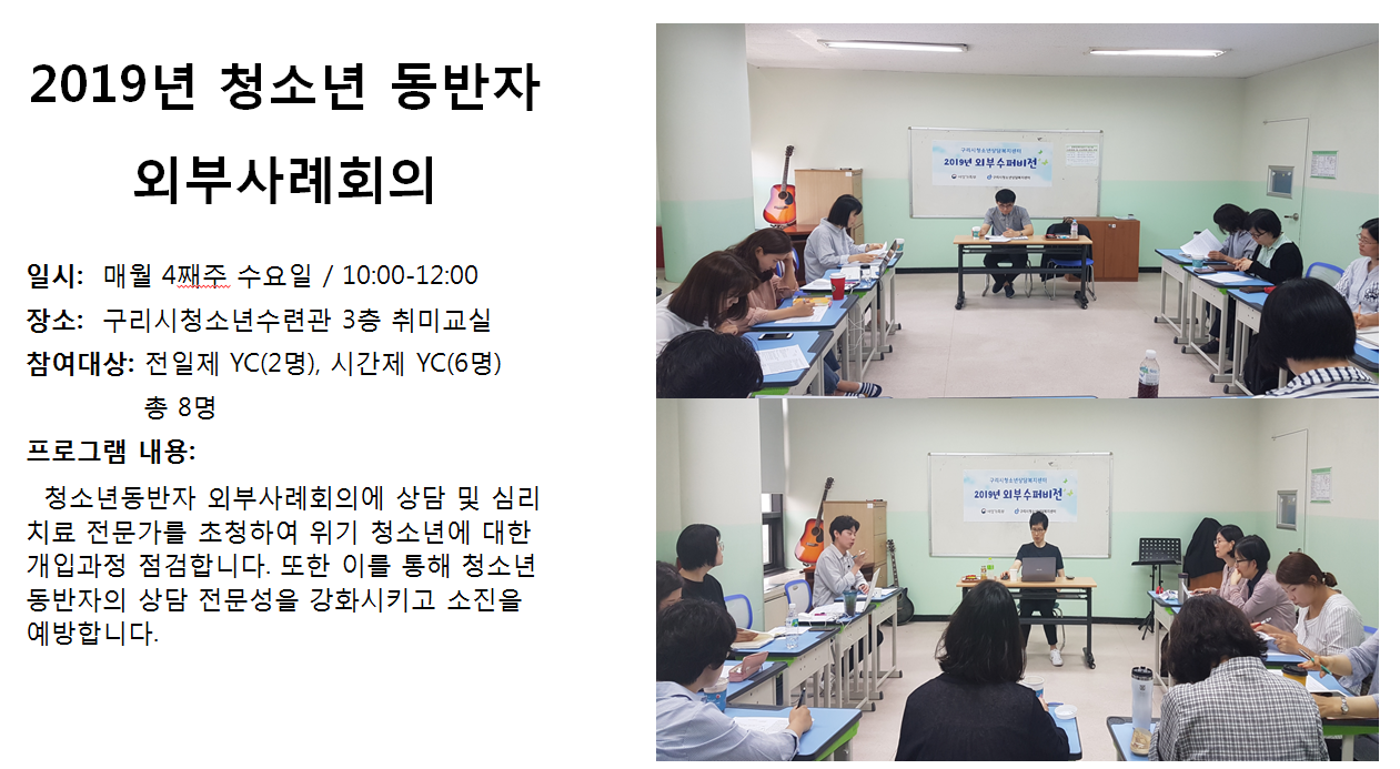 청소년상담복지센터 2019년 6월 외부사례회의 작성자 관리자 등록일자 2019년 7월 5일 17시 33분 58초 조회 361 1562315638_photo_table.png [ Size : 848.61KB , Down : 116 ] 미리보기 다운로드 목록보기