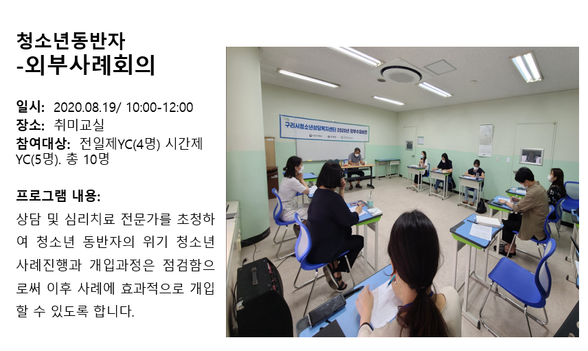 청소년상담복지센터 2020년 8월 YC 외부사례회의 작성자 관리자 등록일자 2020년 9월 7일 15시 34분 54초 조회 345 1599460494_photo_table.png [ Size : 465.66KB , Down : 117 ] 미리보기 다운로드 목록보기