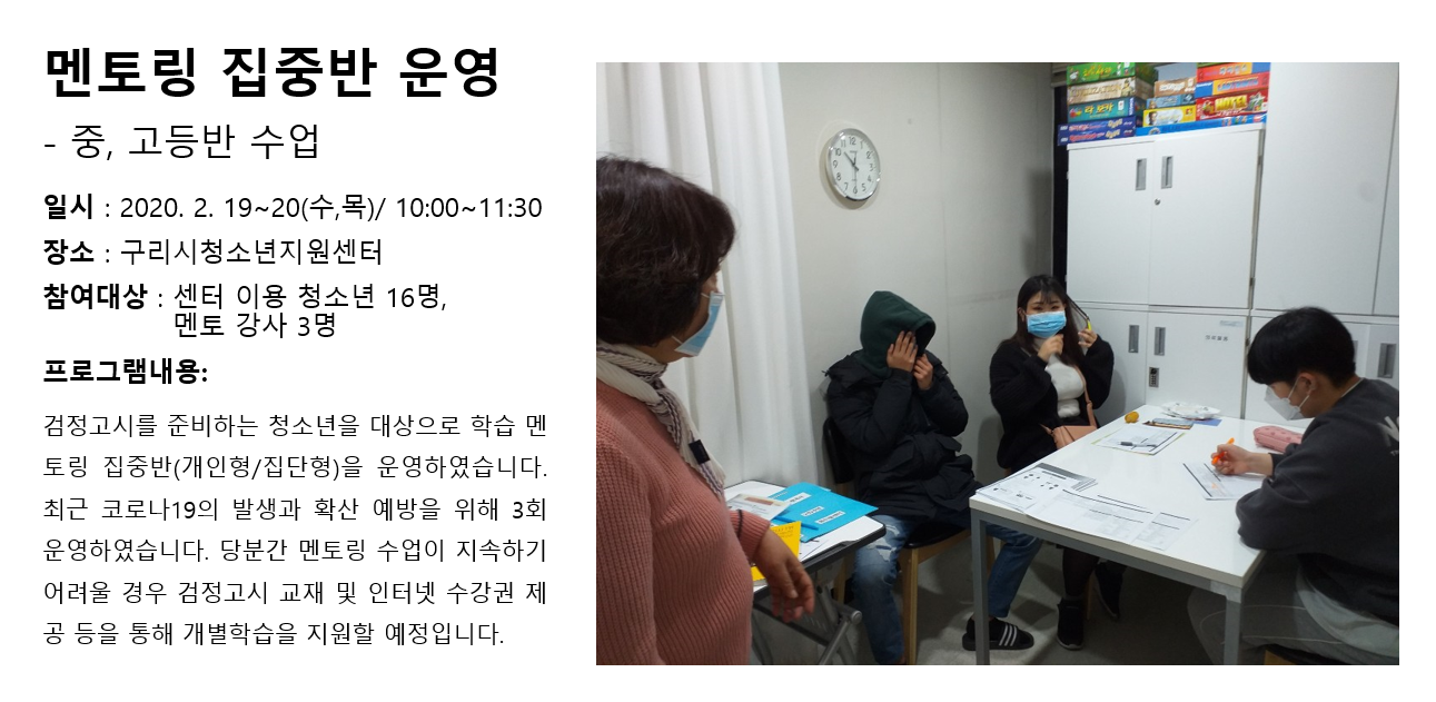 청소년상담복지센터 2020년 2월 멘토링 집중반 운영 - 중,고등반 수업 작성자 관리자 등록일자 2020년 3월 3일 9시 38분 33초 조회 333 1583195913_photo_table.png [ Size : 706.95KB , Down : 106 ] 미리보기 다운로드 목록보기