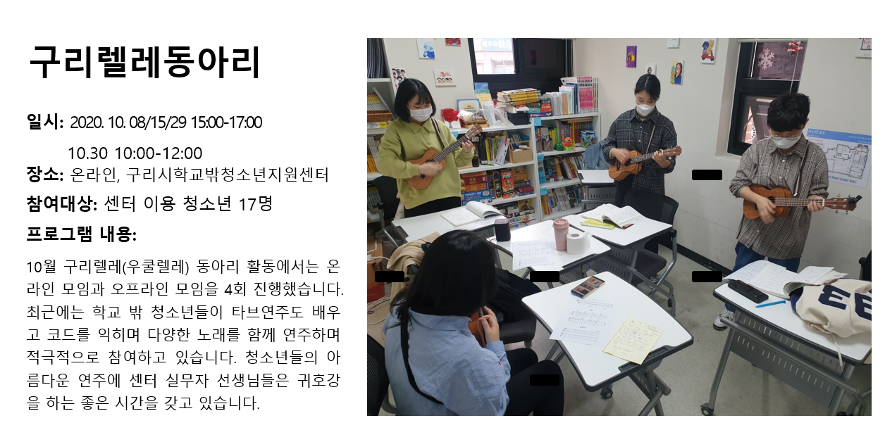 청소년상담복지센터 2020년 10월 구리렐레동아리 작성자 관리자 등록일자 2020년 11월 10일 11시 49분 42초 조회 309 1604976582_photo_table.png [ Size : 796.93KB , Down : 133 ] 미리보기 다운로드 목록보기