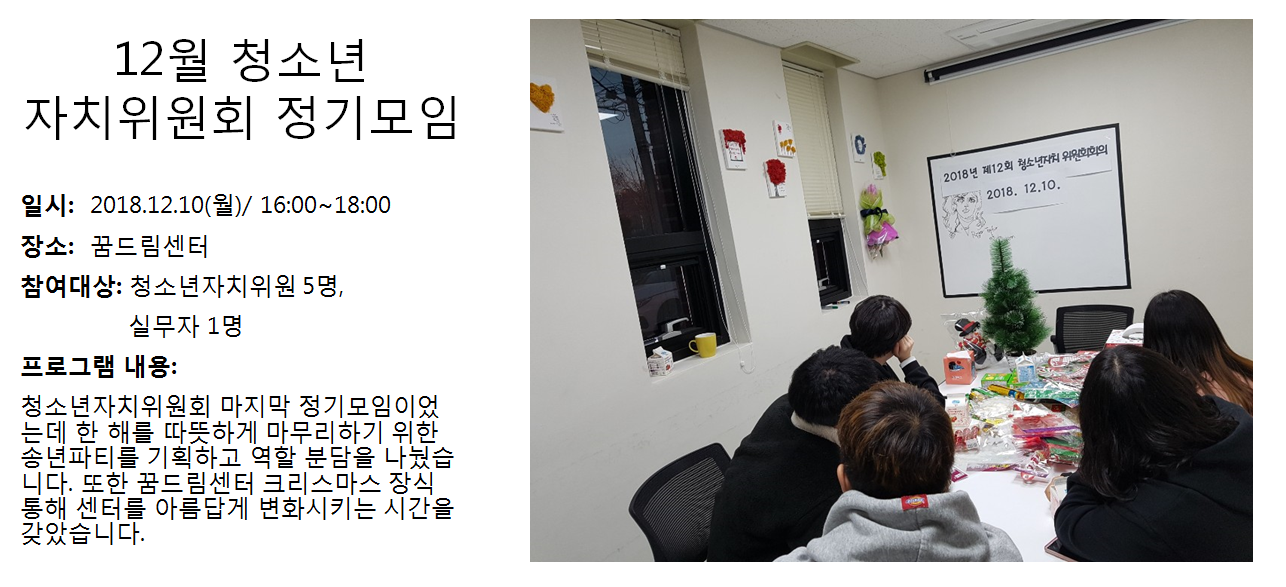 청소년상담복지센터 2018 12월 청소년 자치위원회 정기모임 작성자 관리자 등록일자 2019년 1월 8일 11시 47분 24초 조회 342 1546915644_photo_table.png [ Size : 653.93KB , Down : 104 ] 미리보기 다운로드 목록보기
