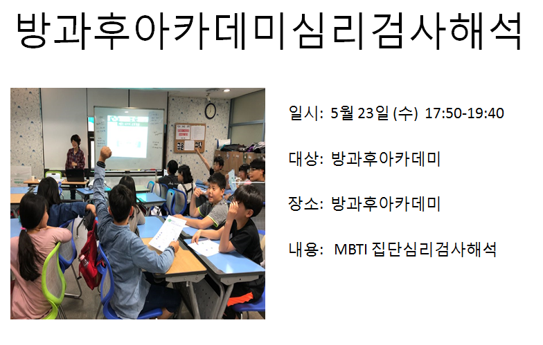 청소년상담복지센터 방과후아카데미 심리검사 해석 작성자 관리자 등록일자 2018년 6월 7일 9시 54분 18초 조회 354 1528332858_photo_table.png [ Size : 327.32KB , Down : 100 ] 미리보기 다운로드 목록보기