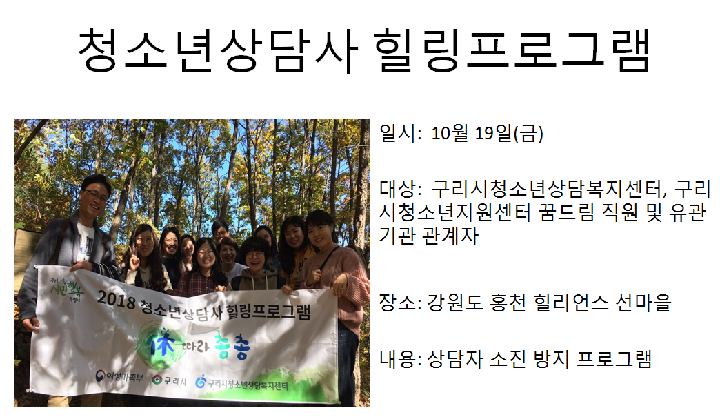 청소년상담복지센터 2018년 청소년상담사 힐림프로그램 작성자 관리자 등록일자 2018년 11월 5일 10시 22분 59초 조회 355 1541380979_photo_table.png [ Size : 606.26KB , Down : 116 ] 미리보기 다운로드 목록보기