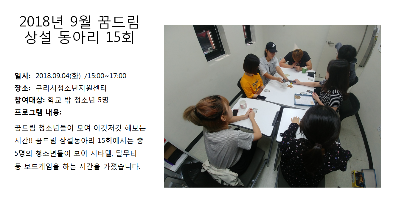 청소년상담복지센터 2018년 9월 꿈드림 상설동아리 15회 작성자 관리자 등록일자 2018년 10월 4일 18시 58분 14초 조회 308 1538647094_photo_table.png [ Size : 729.77KB , Down : 96 ] 미리보기 다운로드 목록보기