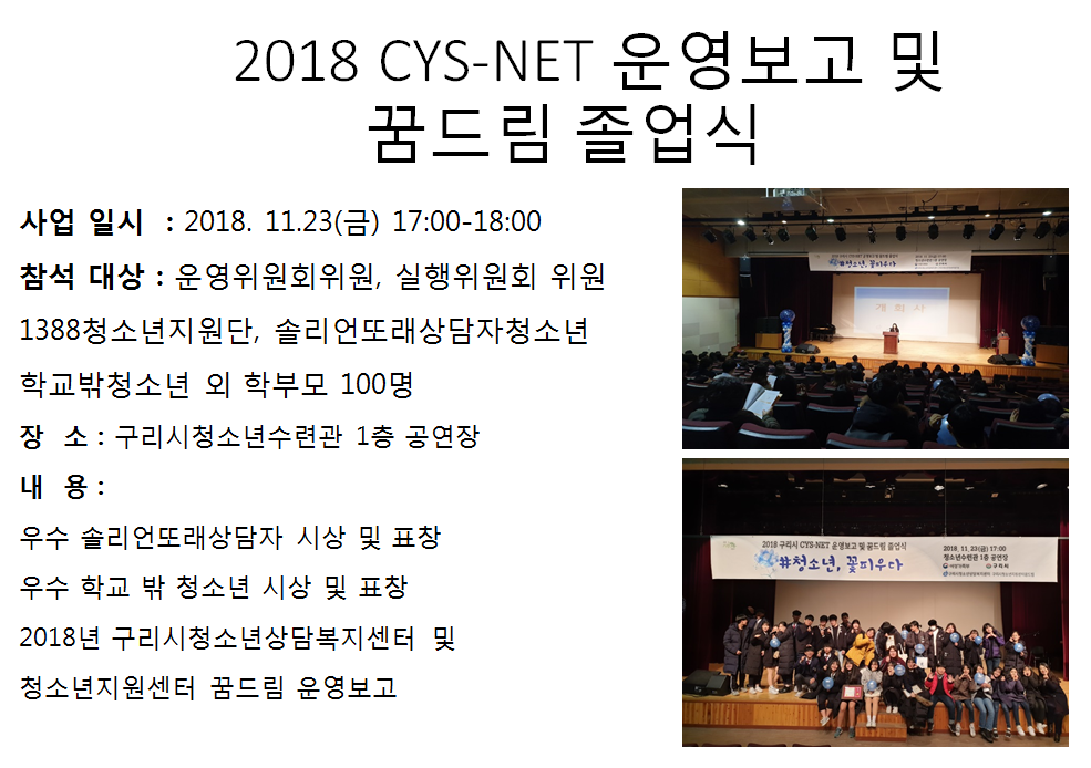 청소년상담복지센터 2018 CYS-NET 운영보고 및 꿈드림 졸업식 작성자 관리자 등록일자 2018년 12월 5일 15시 48분 40초 조회 308 1543992520_photo_table.png [ Size : 393.93KB , Down : 122 ] 미리보기 다운로드 목록보기