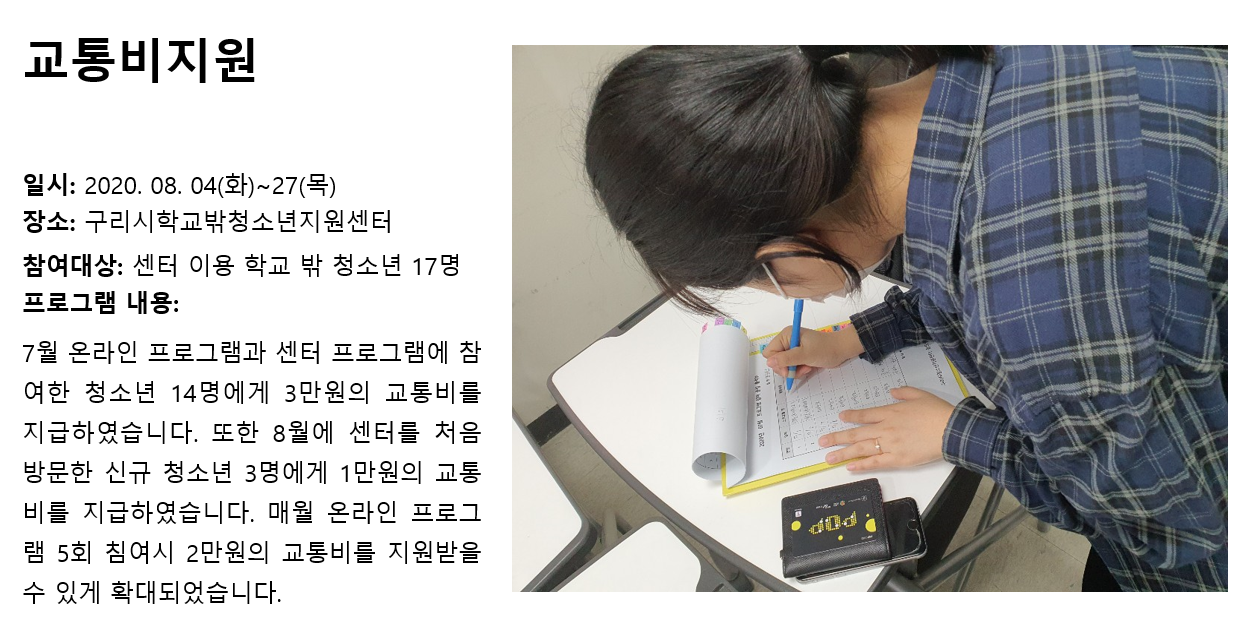 청소년상담복지센터 2020년 8월 교통비 지원 작성자 관리자 등록일자 2020년 9월 3일 11시 23분 41초 조회 256 1599099821_photo_table.png [ Size : 898.33KB , Down : 111 ] 미리보기 다운로드 목록보기