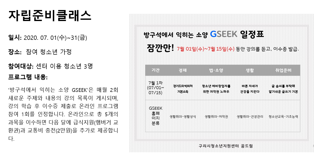 청소년상담복지센터 2020년 7월 자립준비클래스 작성자 관리자 등록일자 2020년 8월 5일 13시 36분 38초 조회 334 1596602198_photo_table.png [ Size : 318.7KB , Down : 116 ] 미리보기 다운로드 목록보기