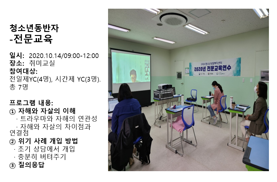 청소년상담복지센터 2020년 10월 YC 전문교육1 작성자 관리자 등록일자 2020년 11월 4일 11시 7분 2초 조회 283 1604455622_photo_table.png [ Size : 516.09KB , Down : 116 ] 미리보기 다운로드 목록보기