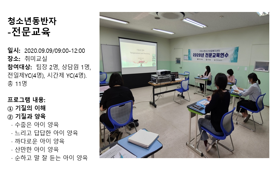 청소년상담복지센터 2020년 9월 YC 전문교육 - 기질의 이해 작성자 관리자 등록일자 2020년 10월 7일 14시 41분 39초 조회 295 1602049299_photo_table.png [ Size : 506.41KB , Down : 105 ] 미리보기 다운로드 목록보기