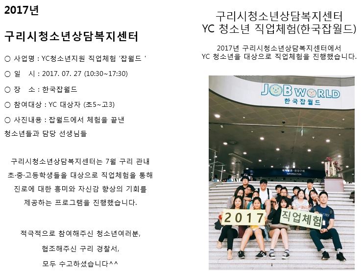 청소년상담복지센터 YC펑소년지원 직업체험 ' 잡월드 ' 작성자 관리자 등록일자 2017년 7월 28일 14시 55분 47초 조회 363 1501221347_photo_table.jpg [ Size : 85.78KB , Down : 116 ] 미리보기 다운로드 목록보기