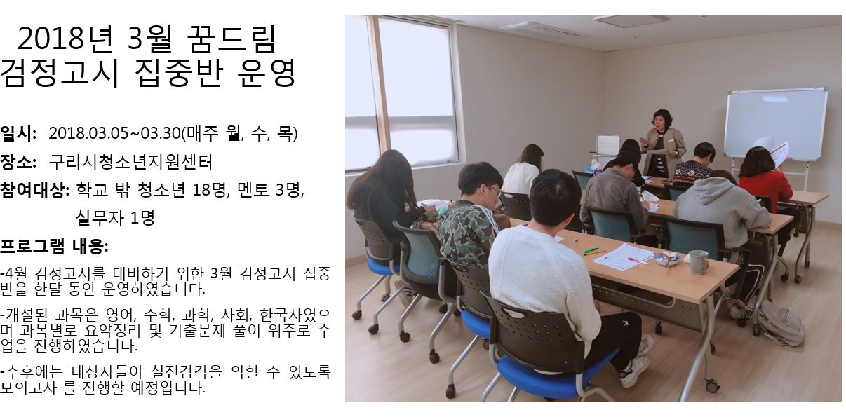 청소년상담복지센터 2018년 3월 꿈드림 검정고시 집중반 운영 작성자 관리자 등록일자 2018년 4월 2일 14시 55분 1초 조회 319 1522648501_photo_table.jpg [ Size : 119.57KB , Down : 109 ] 미리보기 다운로드 목록보기