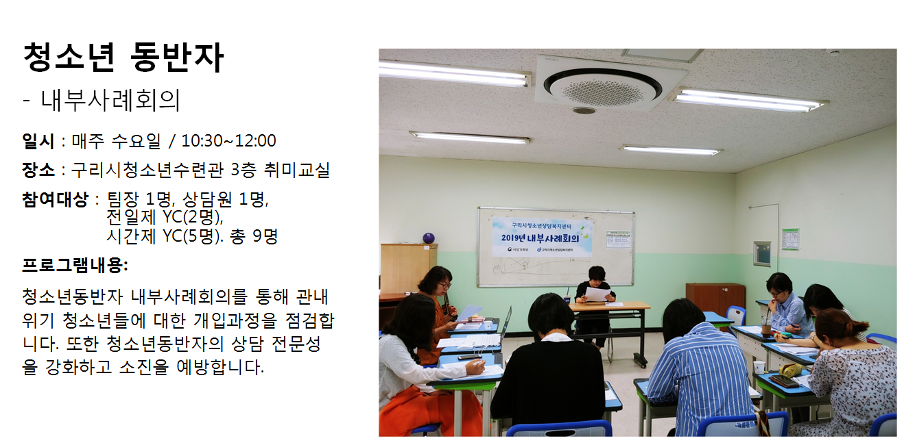 청소년상담복지센터 2019년 8월 내부사례회의 작성자 관리자 등록일자 2019년 9월 11일 14시 52분 50초 조회 312 1568181170_photo_table.png [ Size : 848.26KB , Down : 118 ] 미리보기 다운로드 목록보기