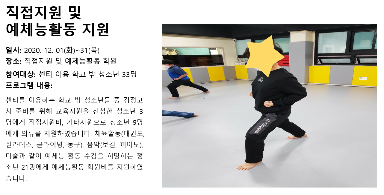 청소년상담복지센터 2020년 12월 직접지원 및 예체능활동지원 작성자 관리자 등록일자 2021년 1월 7일 9시 27분 14초 조회 317 1609979234_photo_table.png [ Size : 484.39KB , Down : 144 ] 미리보기 다운로드 목록보기