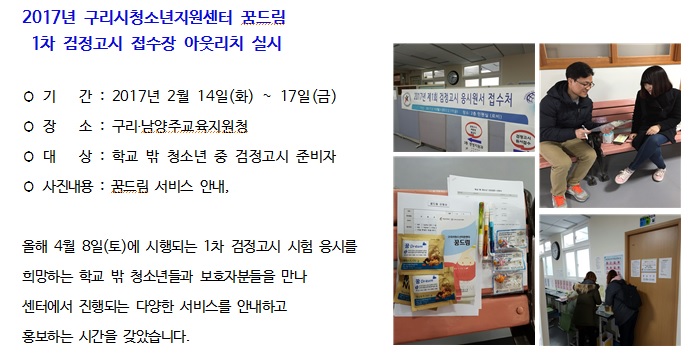청소년상담복지센터 2017년 1차 검정고시 접수장 아웃리치 실시 작성자 관리자 등록일자 2017년 3월 8일 15시 57분 16초 조회 810 1488956236_photo_table.jpg [ Size : 93.74KB , Down : 117 ] 미리보기 다운로드 목록보기
