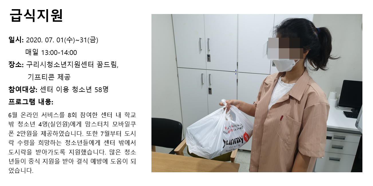 청소년상담복지센터 2020년 7월 급식지원 작성자 관리자 등록일자 2020년 8월 5일 13시 36분 8초 조회 337 1596602168_photo_table.png [ Size : 654.44KB , Down : 109 ] 미리보기 다운로드 목록보기
