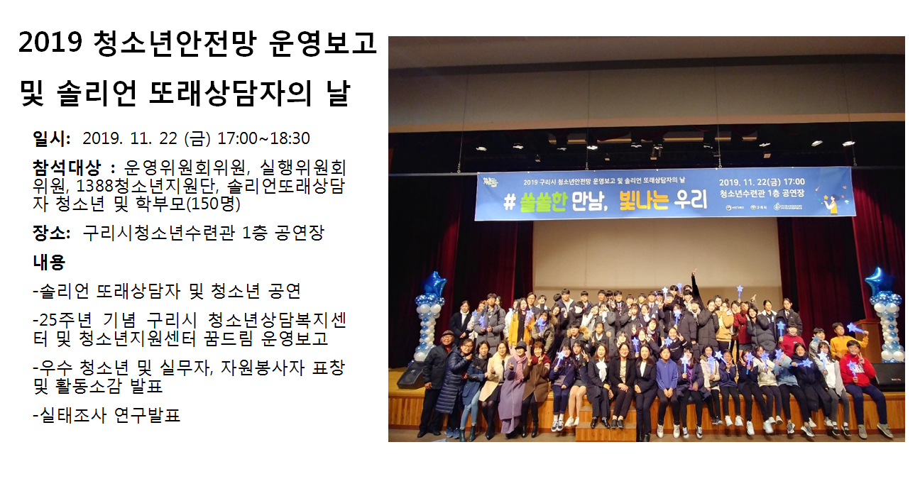 청소년상담복지센터 2019 청소년안전망 운영보고 및 솔리언 또래상담자의 날 작성자 관리자 등록일자 2019년 12월 4일 11시 44분 44초 조회 331 1575427484_photo_table.png [ Size : 908.8KB , Down : 120 ] 미리보기 다운로드 목록보기