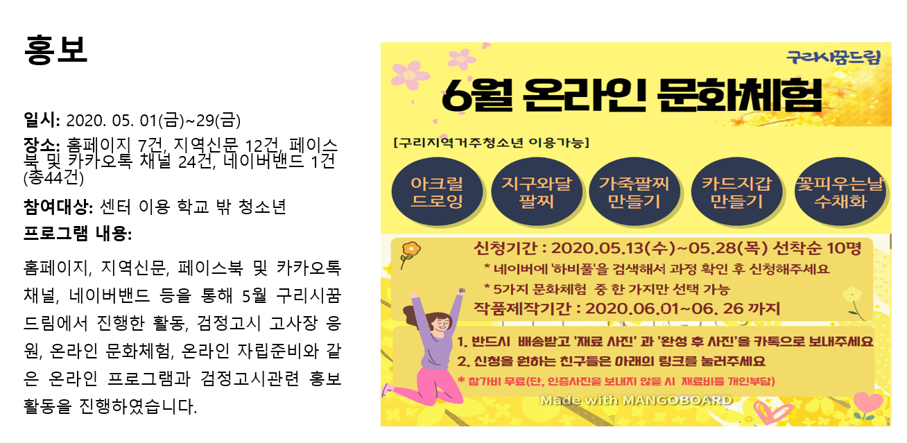 청소년상담복지센터 2020년 5월 홍보 작성자 관리자 등록일자 2020년 6월 5일 10시 3분 55초 조회 307 1591319035_photo_table.png [ Size : 549.99KB , Down : 139 ] 미리보기 다운로드 목록보기