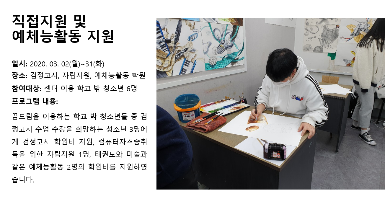 청소년상담복지센터 2020년 3월 직접지원 및 예체능활동 지원 작성자 관리자 등록일자 2020년 4월 6일 11시 25분 36초 조회 288 1586139936_photo_table.png [ Size : 829.68KB , Down : 109 ] 미리보기 다운로드 목록보기