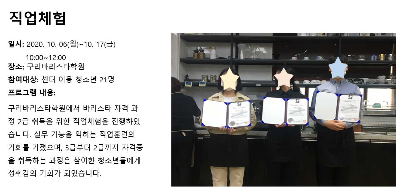 청소년상담복지센터 2020년 10월 직업체험 - 바리스타 작성자 관리자 등록일자 2020년 11월 10일 11시 50분 43초 조회 353 1604976643_photo_table.png [ Size : 722.13KB , Down : 135 ] 미리보기 다운로드 목록보기