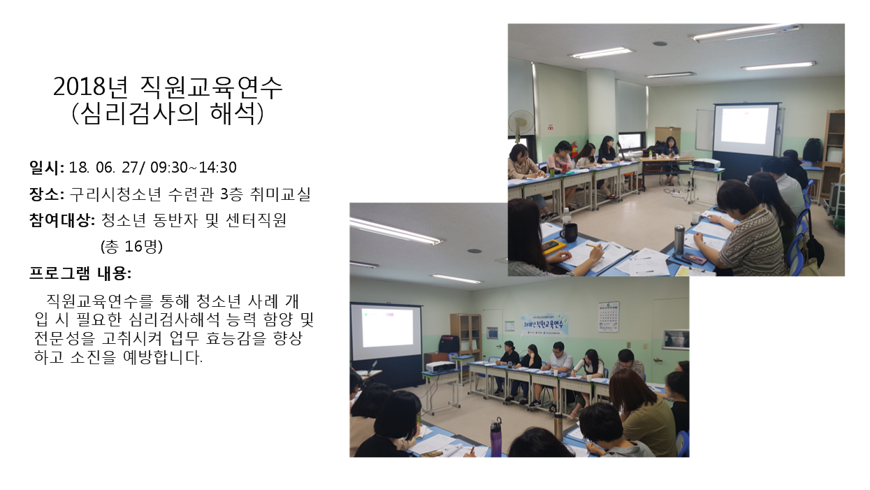 청소년상담복지센터 2018 직원교육연수 (심리검사의 해석) 작성자 관리자 등록일자 2018년 7월 2일 14시 7분 34초 조회 299 1530508054_photo_table.png [ Size : 645.1KB , Down : 176 ] 미리보기 다운로드 목록보기