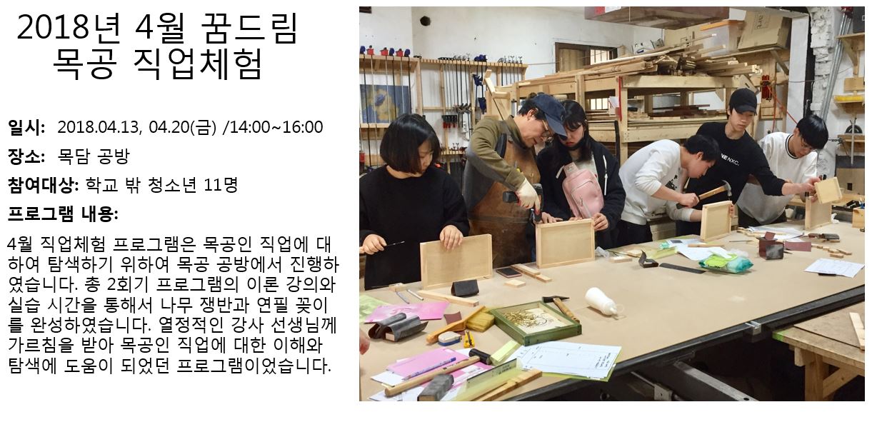 청소년상담복지센터 2018년 4월 꿈드림 목공 직업체험 작성자 관리자 등록일자 2018년 5월 2일 18시 5분 5초 조회 349 1525251905_photo_table.jpg [ Size : 152.35KB , Down : 115 ] 미리보기 다운로드 목록보기