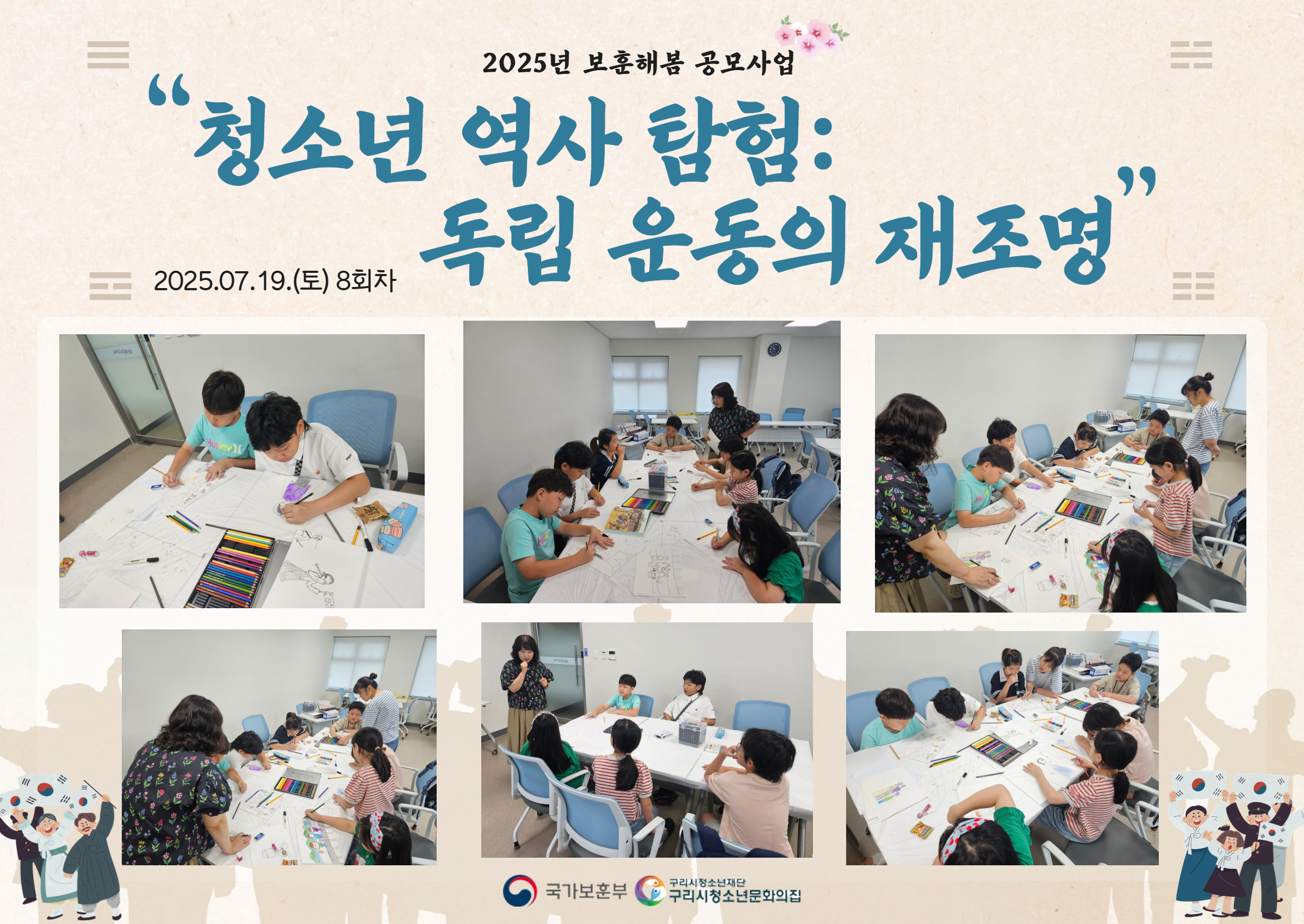 청소년문화의집 보훈부 공모사업 '청소년 역사탐험' 초등부 1기 - 8회차(2025.07.19) 작성자 김윤지 등록일자 2025년 7월 19일 12시 35분 21초 조회 87 국가보훈부 공모사업 '청소년 역사탐험: 독립 운동의 재조명'초등부 1기 8회차 - 일러스트 작업Ⅰ(10시~12시 총 2시간) 활동기록(공모사업).jpg [ Size : 3.37MB , Down : 37 ] 미리보기 다운로드 목록보기