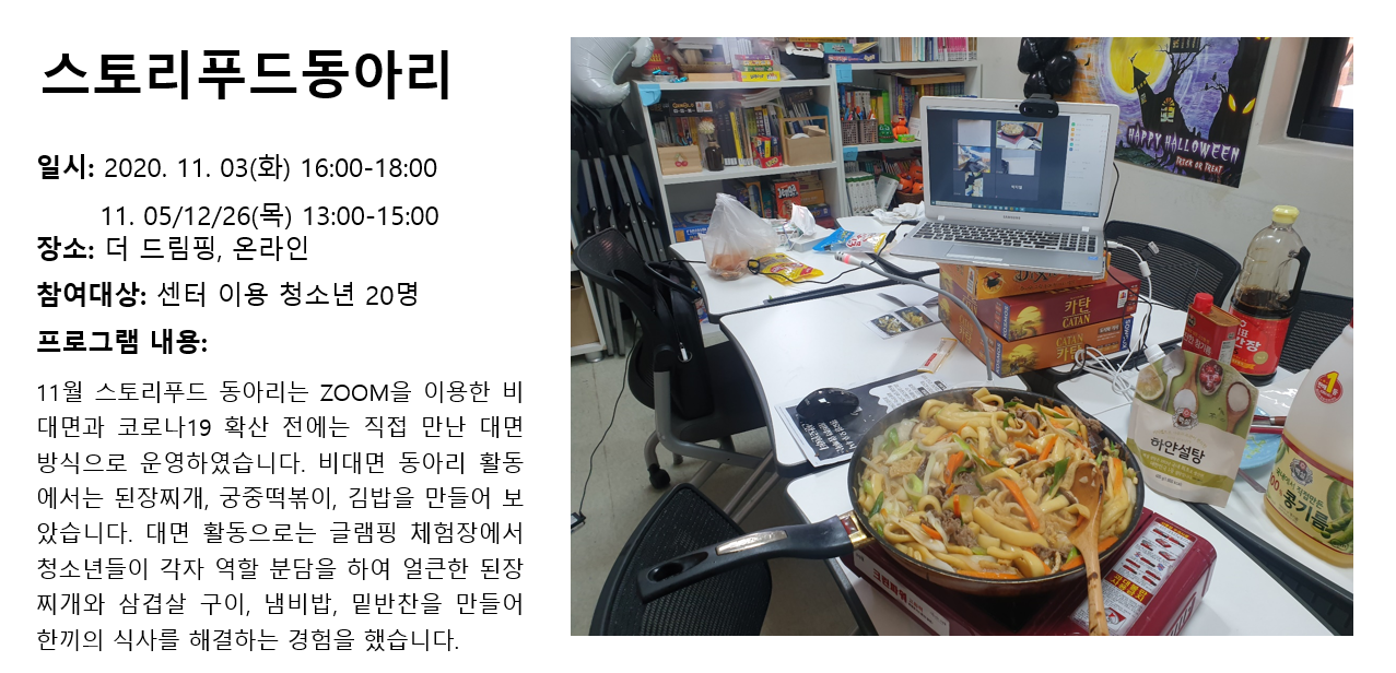 청소년상담복지센터 2020년 11월 스토리푸드동아리 작성자 관리자 등록일자 2020년 12월 4일 11시 13분 19초 조회 367 1607047999_photo_table.png [ Size : 933.95KB , Down : 135 ] 미리보기 다운로드 목록보기