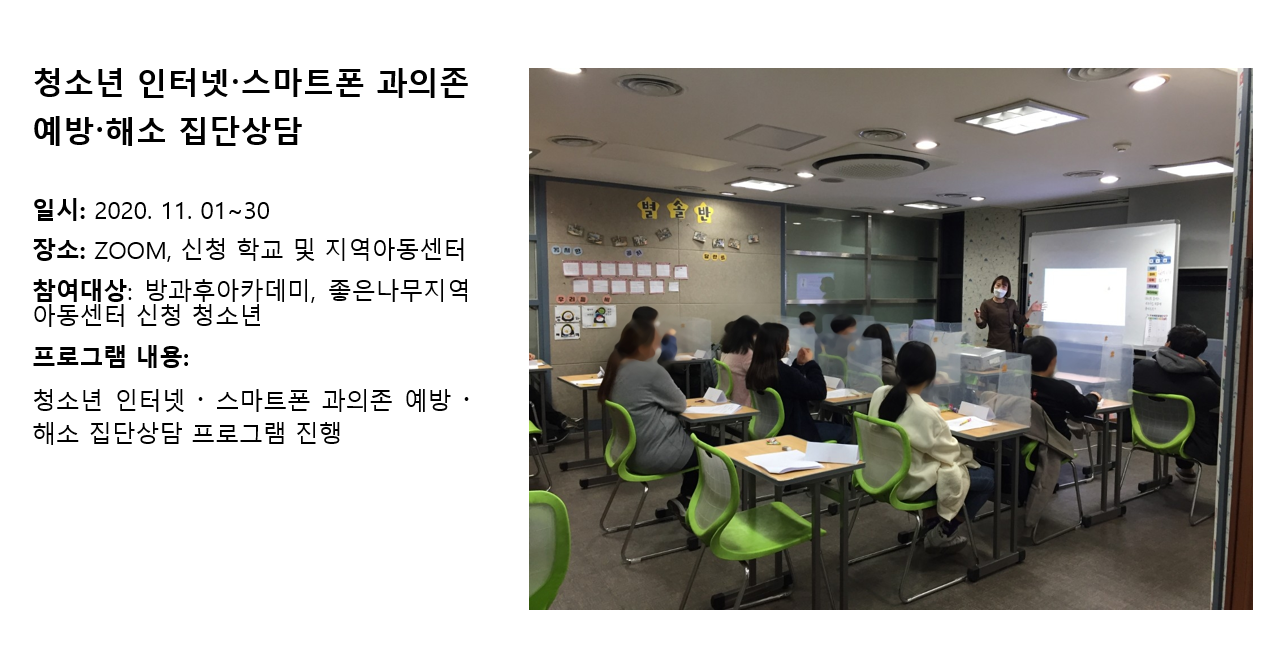 청소년상담복지센터 2020년 11월 청소년 인터넷.스마트폰 과의존 예방해소 집단상담 작성자 관리자 등록일자 2020년 12월 8일 10시 49분 28초 조회 364 1607392168_photo_table.png [ Size : 788.33KB , Down : 143 ] 미리보기 다운로드 목록보기