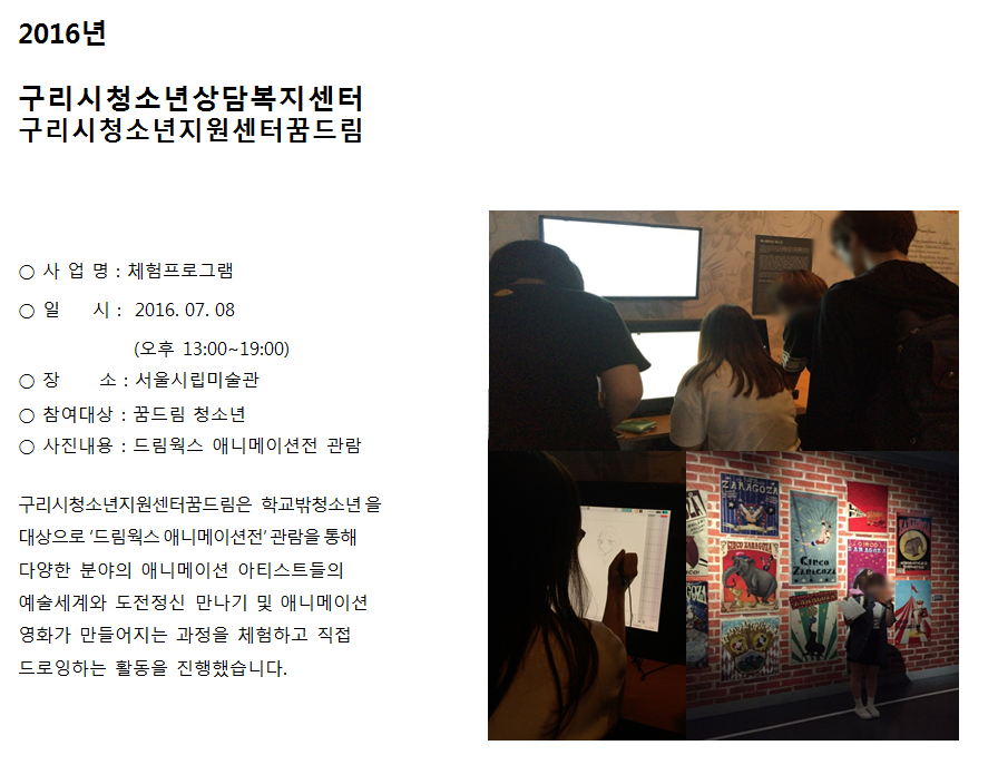 청소년상담복지센터 [꿈드림] 체험프로그램 '드림웍스 애니메이션'전시관람 작성자 관리자 등록일자 2016년 7월 15일 17시 6분 42초 조회 512 내용없음 1468570002_photo_table.png [ Size : 494.09KB , Down : 97 ] 미리보기 다운로드 목록보기