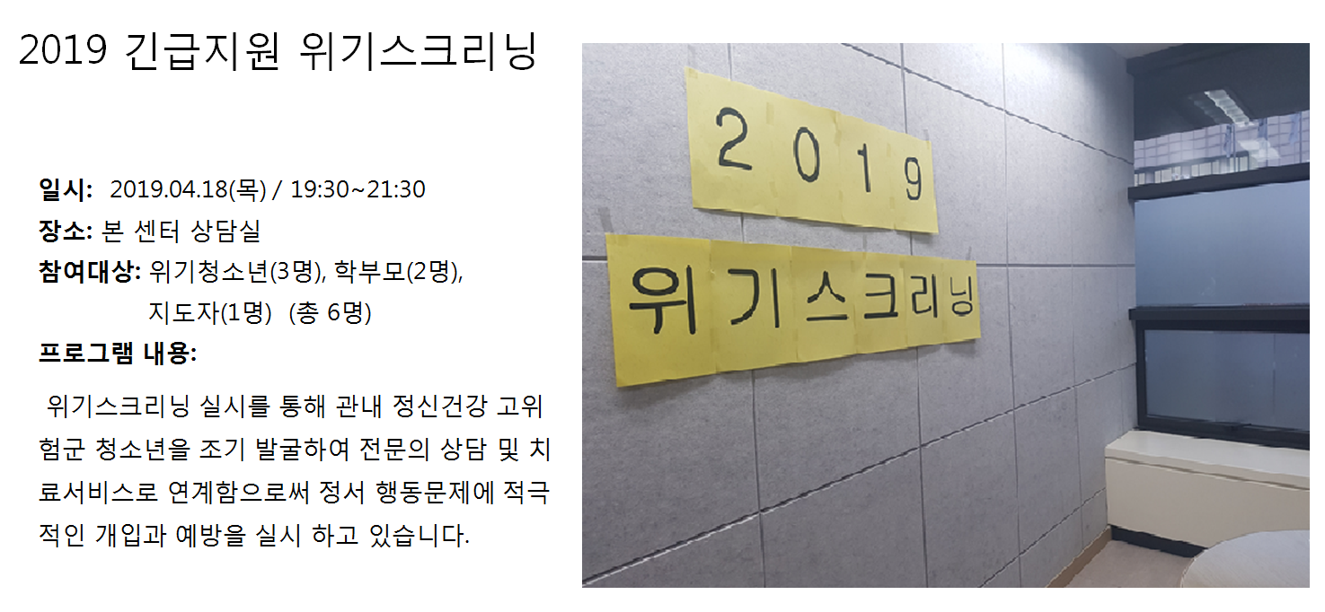 청소년상담복지센터 2019년 4월 긴급지원 위기스크리닝 작성자 관리자 등록일자 2019년 5월 8일 15시 44분 11초 조회 334 1557297851_photo_table.png [ Size : 801.85KB , Down : 108 ] 미리보기 다운로드 목록보기
