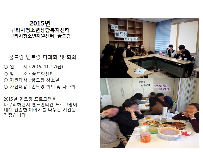 청소년상담복지센터 [꿈드림] 멘토링 다과회 작성자 관리자 등록일자 2015년 12월 22일 11시 45분 4초 조회 758 1450752304_photo_table.jpg [ Size : 79.47KB , Down : 110 ] 미리보기 다운로드 목록보기