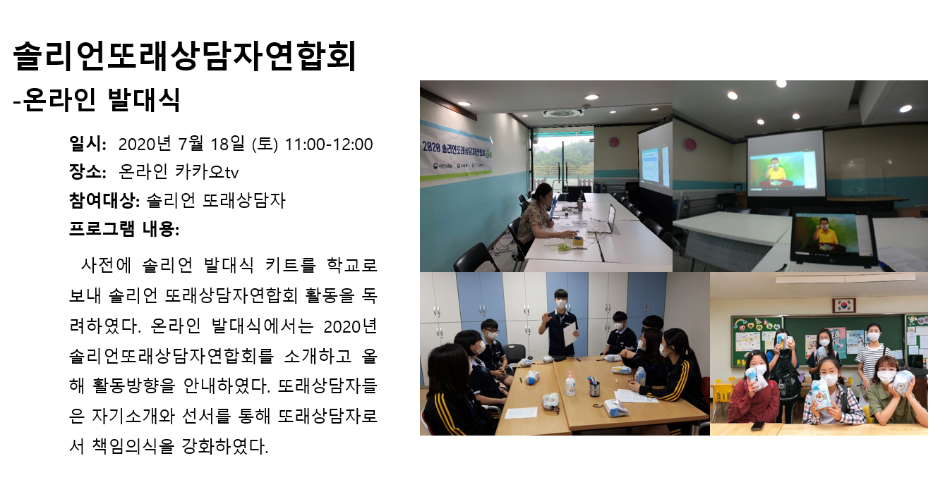청소년상담복지센터 2020년 7월 솔리언또래상담자연합회 온라인 발대식 작성자 관리자 등록일자 2020년 8월 5일 10시 14분 16초 조회 321 1596590056_photo_table.png [ Size : 761.81KB , Down : 129 ] 미리보기 다운로드 목록보기