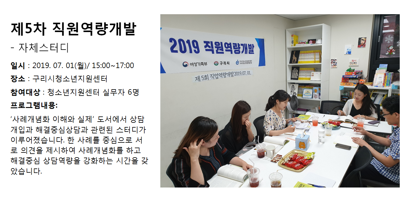 청소년상담복지센터 2019년 제5차 직원역량개발 - 자체스터디 작성자 관리자 등록일자 2019년 8월 1일 14시 58분 43초 조회 296 1564639123_photo_table.png [ Size : 852.19KB , Down : 102 ] 미리보기 다운로드 목록보기