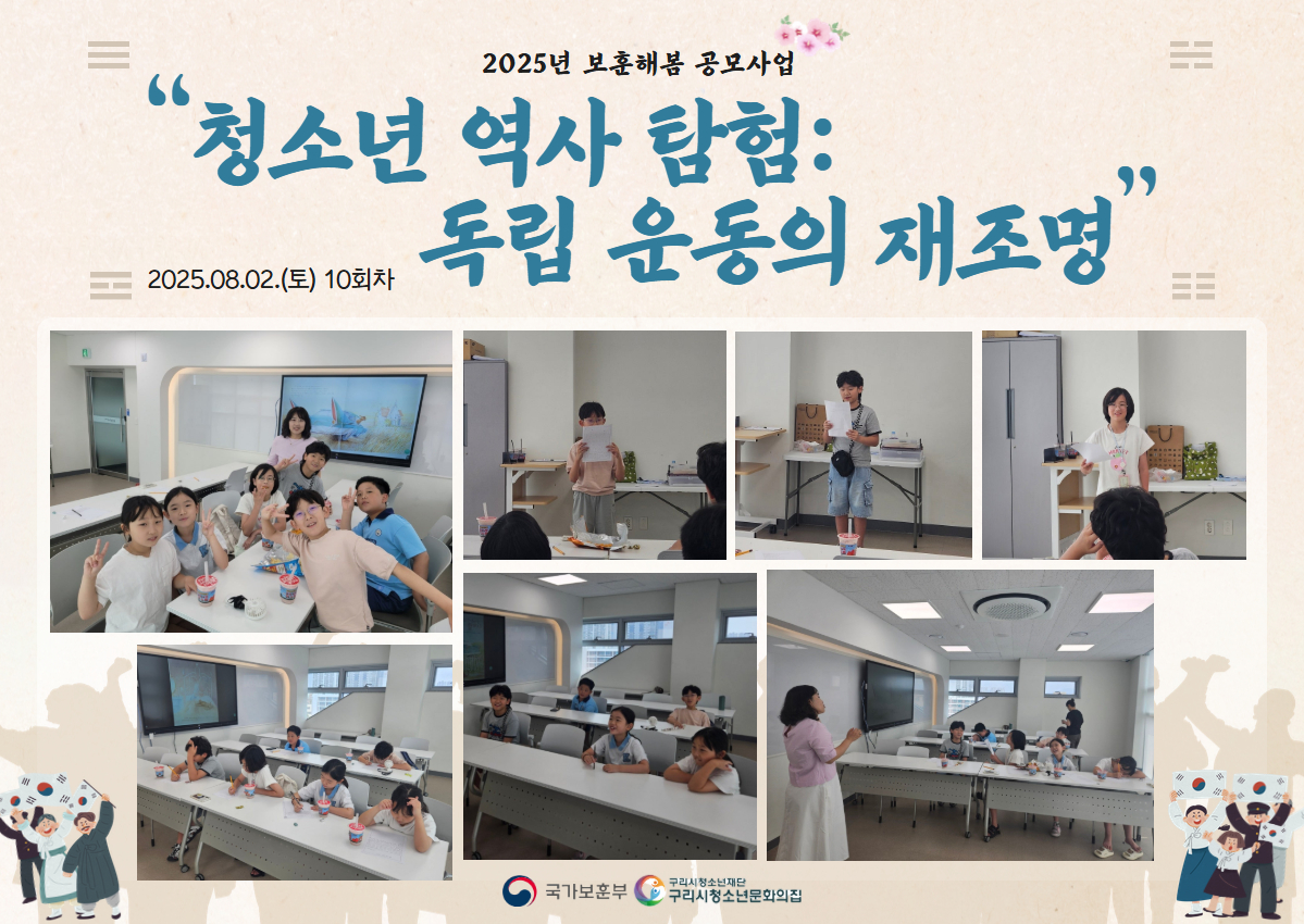 청소년문화의집 보훈부 공모사업 '청소년 역사탐험' 초등부 1기 - 10회차(2025.08.02) 작성자 김윤지 등록일자 2025년 8월 5일 14시 17분 34초 조회 77 국가보훈부 공모사업 '청소년 역사탐험: 독립 운동의 재조명'초등부 1기 10회차 - 원고 마무리 및 그림책 출판(10시~12시 총 2시간) 활동기록(공모사업) 8.jpg [ Size : 1010.75KB , Down : 34 ] 미리보기 다운로드 목록보기