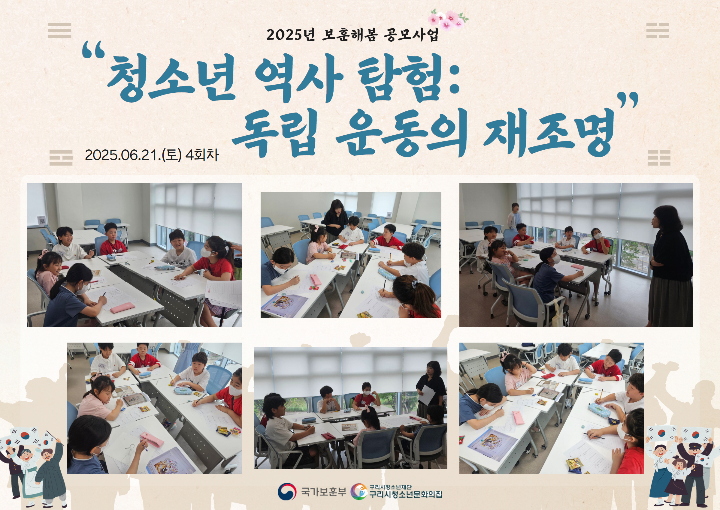 청소년문화의집 보훈부 공모사업 '청소년 역사탐험' 초등부 1기 - 4회차(2025.06.21) 작성자 김윤지 등록일자 2025년 6월 22일 11시 17분 56초 조회 108 국가보훈부 공모사업 '청소년 역사탐험: 독립 운동의 재조명'초등부 1기 4회차 - 그림책 원고 작업Ⅰ(원고쓰기)(10시~12시 총 2시간) 활동기록(공모사업) (1).jpg [ Size : 3.35MB , Down : 56 ] 미리보기 다운로드 목록보기